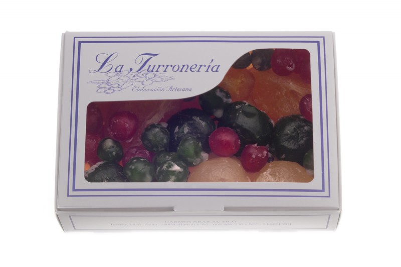 Confitada naranja, pera, ciruela, calabaza, mandarina, melocotón y albaricoque. Posteriormente cubrierta cada pieza con una fina capa de glaseado.