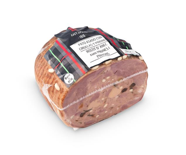 Una pieza de pato del Penedés rellena con diferentes carnes de pato y cerdo, cocinadas con verduras y acompañado de ciruelas, piñones, orejones y trozos de foie gras. Asado al horno con especias.