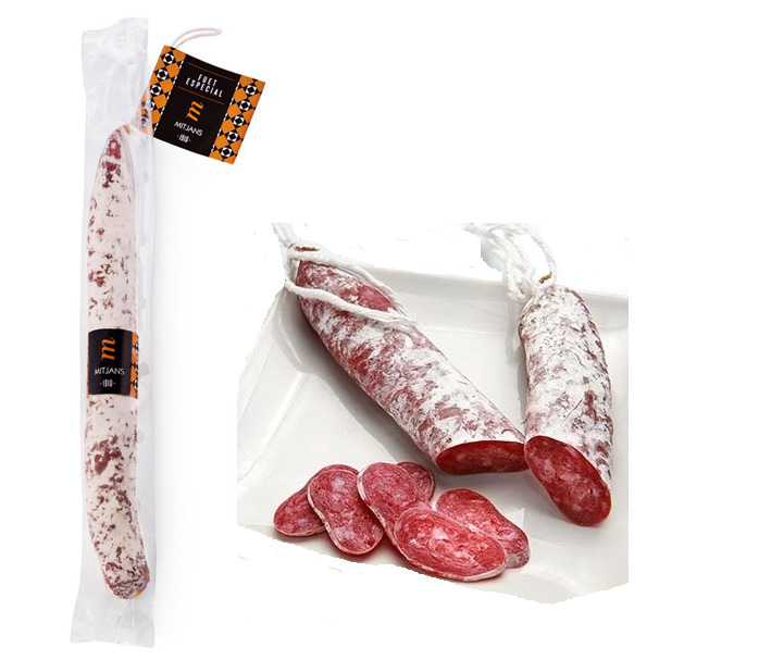 Picado y aderezado según fórmula de la familia y sometido a un proceso de curación tranquila con un corto período de maceración y posterior secado con aparición de flora natural. Esta le confiere una forma redondeada y una intensidad de color y sabor. Se puede notar el auténtico sabor de embutido ibérico.