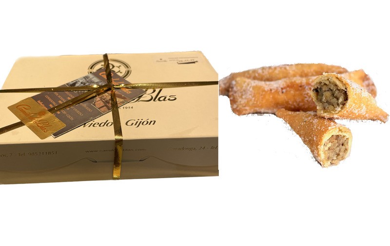 Pastel de hojaldre, relleno de crema artesana de nuez, frito en aceite de oliva y cubierto de azúcar y canela.