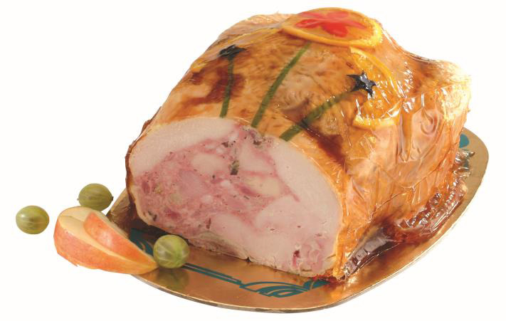 Capón (26,7%) ,papada de cerdo,carne de pava,agua,carne de pollo,hígado de pollo,grasa cerdo,manzanas (2,7%),ciruelas (2,7%) ,sal,vino Oporto tinto, LECHE, HUEVOS, plantas aromáticas,dextrosa,proteínas LECHE,hueso de pollo,grasa pollo,especias,aromas y aromas naturales,antioxidante:eritorbato de sodio y ascorbato de sodio,conservador:nitritodesodio.