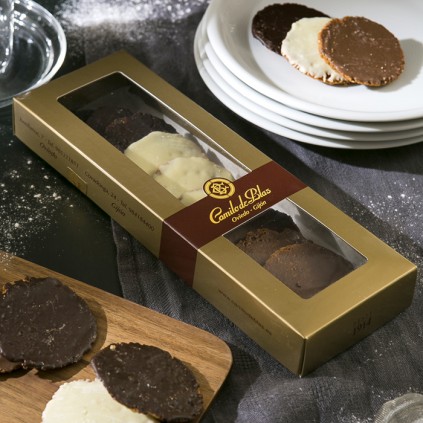 Finas pastas de almendra Marcona cubiertas por una de sus caras de chocolate blanco, negro y con leche.