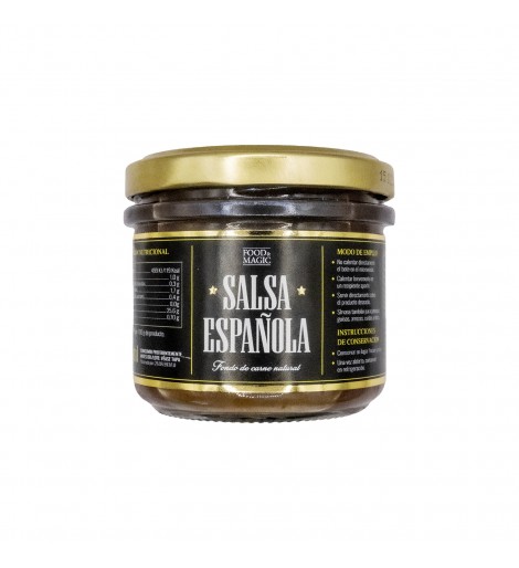 Base para salsa española (agua, huesos de ternera, vino tinto (contiene sulfitos), cebolla, tomate, zanahoria, vino fino, almidón modificado de maiz, caldo líquido concentrado de carne, harina de trigo (gluten), tomate concentrado, aceite de oliva, bebida espirituosa, sal, puerro, caldo sabor carne deshidratado, ajo, colorante (E150 d), pimienta negra, tomillo, romero y laurel), vino tinto (contiene sulfitos), agua, almidón modificado de maíz, azúcar y sal