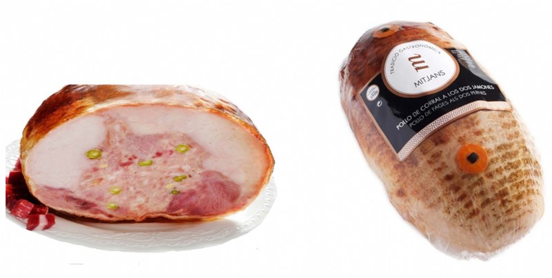 Una pieza de pollo, relleno con diferentes carnes de pollo y cerdo, cocinadas con verduras y acompañado de jamón curado y jamón cocido, huevos duros, pistachos y aliñado con jugo de trufa. Asado al horno con licor y una breza de verduras para conseguir un Producto de cocina tradicional y de sabor diferenciado.