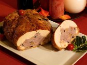 Pularda deshuesada rellena (86%)(carne de ternera picada, huevo líquido pasteurizado, nata líquida, jamón ibérico, foie gras de pato, vino oporto, uvas pasas, piñones, sal , trufa Tuber Indicum, aceite de trufa blanca y pimienta negra), caldo de pollo con verduras (agua de cocción de pollo, cebolla, zanahoria, puerro, apio, col y sal), vino oporto, aceite de trufa blanca , ciruelas sin hueso, aceite de oliva virgen extra, sal y pimienta